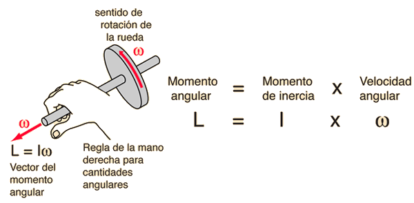 El momento angular de un sólido rígido, se definee como el producto del momento de inercia por lavelocidad angular. Es análogo al momento lineal y está sujeto a las restricción del principio fundamental de la conservación del momento angular si no actuan pares externos sobre el objeto. El momento angular es una cantidad vectorial. Se deriva de la expresión del momento angular de una partícula